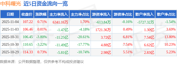 证券之星消息,截至2025年11月4日收盘,中科曙光(603019)报收于107.22元,上涨0.71%,换手率2.36%,成交量34.55万手,成交额37.25亿元。