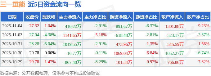 证券之星消息,截至2025年11月4日收盘,三一重能(688349)报收于27.32元,上涨1.04%,换手率2.08%,成交量5.14万手,成交额1.41亿元。