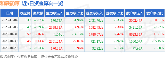证券之星消息,截至2025年11月4日收盘,和展能源(000809)报收于3.39元,下跌2.87%,换手率10.29%,成交量84.87万手,成交额2.91亿元。