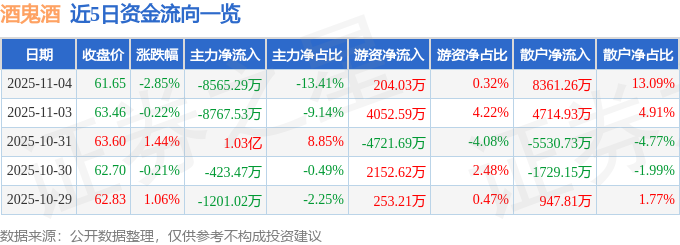 证券之星消息,截至2025年11月4日收盘,酒鬼酒(000799)报收于61.65元,下跌2.85%,换手率3.18%,成交量10.32万手,成交额6.39亿元。
