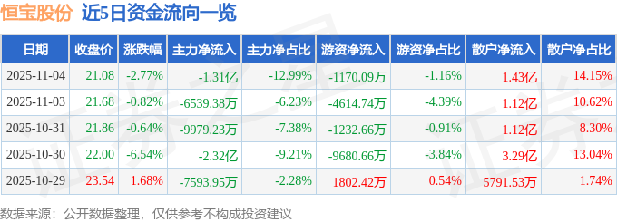 证券之星消息,截至2025年11月4日收盘,恒宝股份(002104)报收于21.08元,下跌2.77%,换手率7.95%,成交量47.7万手,成交额10.09亿元。