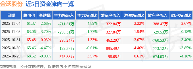 证券之星消息,截至2025年11月4日收盘,金沃股份(300984)报收于61.37元,下跌2.68%,换手率3.04%,成交量2.36万手,成交额1.45亿元。