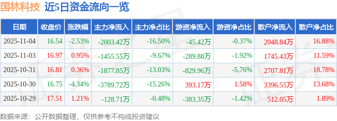 证券之星消息,截至2025年11月4日收盘,国林科技(300786)报收于16.54元,下跌2.53%,换手率4.98%,成交量7.3万手,成交额1.21亿元。