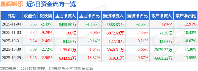 证券之星消息,截至2025年11月4日收盘,星辉娱乐(300043)报收于6.65元,下跌2.49%,换手率9.71%,成交量120.8万手,成交额8.02亿元。
