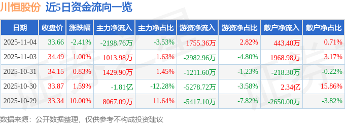 证券之星消息,截至2025年11月4日收盘,川恒股份(002895)报收于33.66元,下跌2.41%,换手率3.04%,成交量18.16万手,成交额6.22亿元。