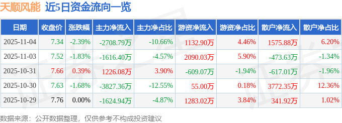证券之星消息,截至2025年11月4日收盘,天顺风能(002531)报收于7.34元,下跌2.39%,换手率1.93%,成交量34.49万手,成交额2.54亿元。