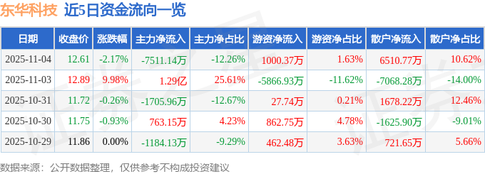 证券之星消息,截至2025年11月4日收盘,东华科技(002140)报收于12.61元,下跌2.17%,换手率8.9%,成交量48.35万手,成交额6.13亿元。