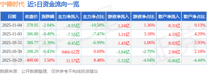 证券之星消息,截至2025年11月4日收盘,宁德时代(300750)报收于378.95元,下跌2.04%,换手率0.56%,成交量23.94万手,成交额90.92亿元。