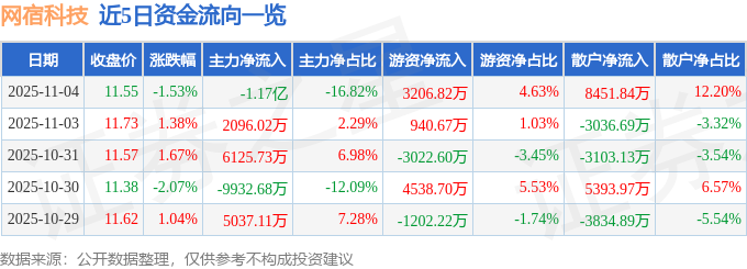 11月4日的资金流向数据方面,主力资金净流出1.17亿元,占总成交额16.82%,游资资金净流入3206.82万元,占总成交额4.63%,散户资金净流入8451.84万元,占总成交额12.2%。