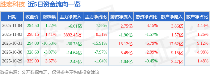 证券之星消息,截至2025年11月4日收盘,胜宏科技(300476)报收于294.5元,下跌1.22%,换手率3.42%,成交量29.24万手,成交额87.1亿元。