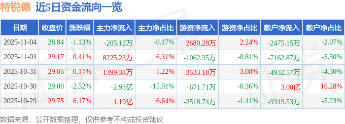 证券之星消息,截至2025年11月4日收盘,特锐德(300001)报收于28.84元,下跌1.13%,换手率3.97%,成交量40.95万手,成交额11.96亿元。