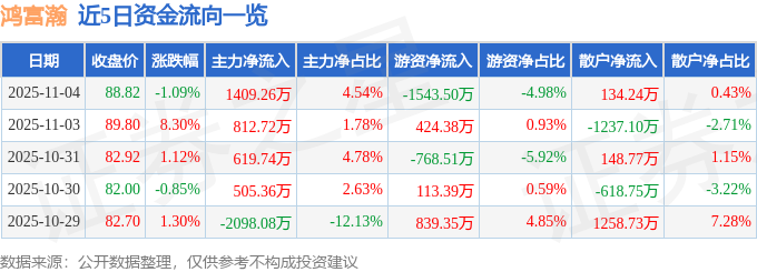 证券之星消息,截至2025年11月4日收盘,鸿富瀚(301086)报收于88.82元,下跌1.09%,换手率7.28%,成交量3.45万手,成交额3.1亿元。