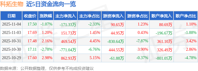 证券之星消息,截至2025年11月4日收盘,科拓生物(300858)报收于17.5元,下跌1.07%,换手率2.17%,成交量4.2万手,成交额7354.89万元。
