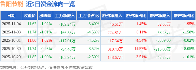 证券之星消息,截至2025年11月4日收盘,鲁阳节能(002088)报收于11.62元,下跌1.02%,换手率0.55%,成交量2.76万手,成交额3211.94万元。