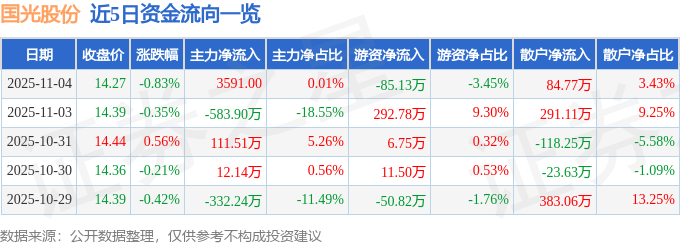 证券之星消息,截至2025年11月4日收盘,国光股份(002749)报收于14.27元,下跌0.83%,换手率0.38%,成交量1.73万手,成交额2470.09万元。