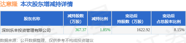 证券之星消息,11月4日达意隆发布公告《达意隆:关于持股5%以上股东权益变动触及1%整数倍暨减持计划实施完毕的公告》,其股东深圳乐丰投资管理有限公司于2025年11月3日合计减持367.37万股,占公司目前总股本的1.8458%,变动期间该股股价上涨0.59%,截止11月3日收盘报13.68元。