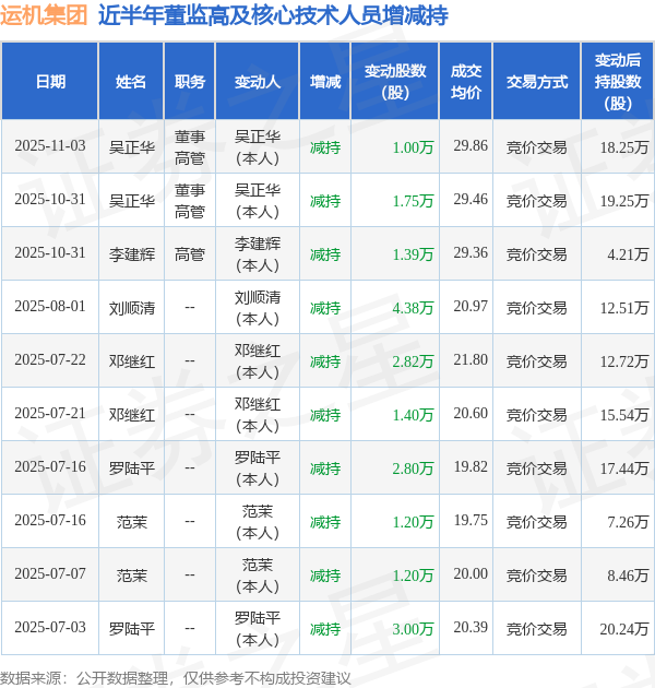 运机集团近半年内的董监高及核心技术人员增减持详情如下: