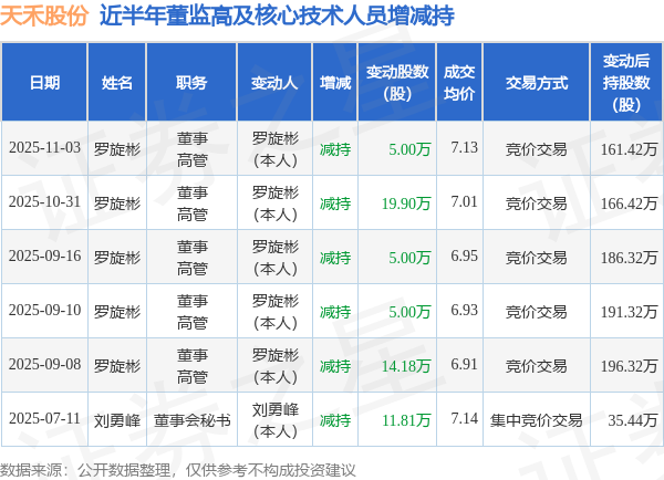 证券之星消息,根据11月4日市场公开信息、上市公司公告及交易所披露数据整理,天禾股份(002999)最新董监高及相关人员股份变动情况:2025年11月3日公司董事,高管罗旋彬共减持公司股份5.0万股,占公司总股本为0.0144%。变动期间公司股价上涨2.0%,11月3日当日收盘报7.14元。