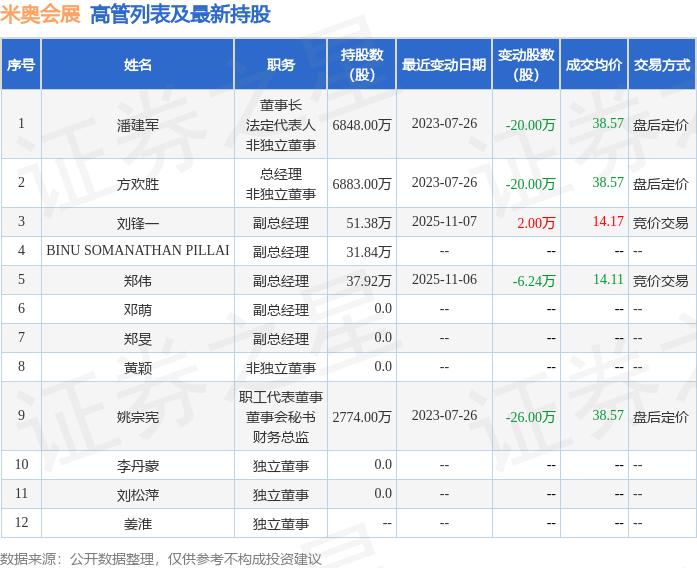米奥会展近半年内的董监高及核心技术人员增减持详情如下:
