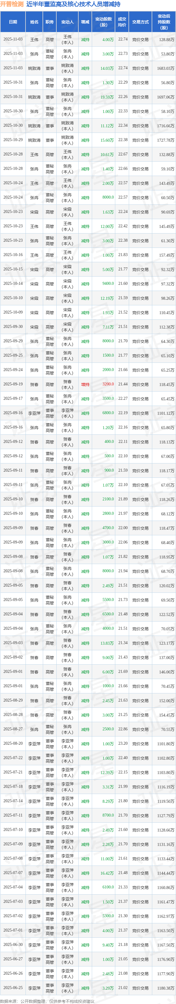 开普检测近半年内的董监高及核心技术人员增减持详情如下: