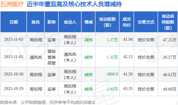 五洲医疗近半年内的董监高及核心技术人员增减持详情如下: