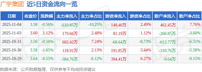 11月4日的资金流向数据方面,主力资金净流出610.85万元,占总成交额10.25%,游资资金净流入148.4万元,占总成交额2.49%,散户资金净流入462.45万元,占总成交额7.76%。