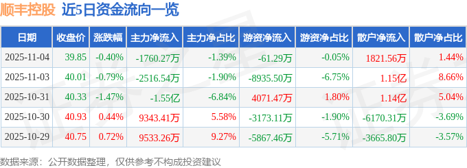 证券之星消息,截至2025年11月4日收盘,顺丰控股(002352)报收于39.85元,下跌0.4%,换手率0.66%,成交量31.7万手,成交额12.63亿元。