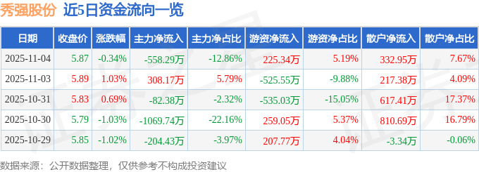 证券之星消息,截至2025年11月4日收盘,秀强股份(300160)报收于5.87元,下跌0.34%,换手率0.97%,成交量7.39万手,成交额4342.9万元。