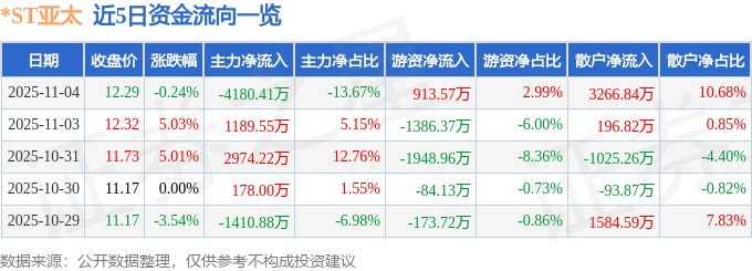 证券之星消息,截至2025年11月4日收盘,*ST亚太(000691)报收于12.29元,下跌0.24%,换手率7.57%,成交量24.48万手,成交额3.06亿元。
