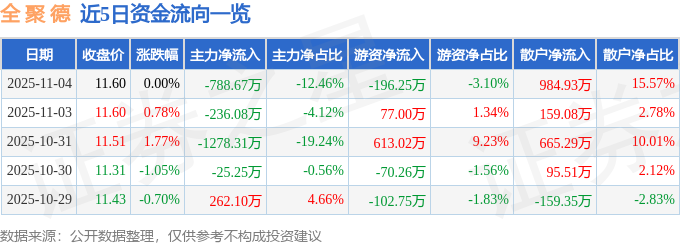 11月4日的资金流向数据方面,主力资金净流出788.67万元,占总成交额12.46%,游资资金净流出196.25万元,占总成交额3.1%,散户资金净流入984.93万元,占总成交额15.57%。