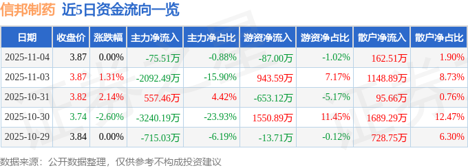 证券之星消息,截至2025年11月4日收盘,信邦制药(002390)报收于3.87元,上涨0.0%,换手率1.16%,成交量22.27万手,成交额8566.44万元。
