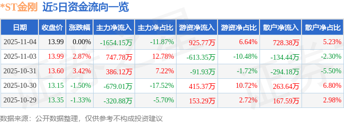 证券之星消息,截至2025年11月4日收盘,*ST金刚(300093)报收于13.99元,上涨0.0%,换手率4.39%,成交量9.46万手,成交额1.39亿元。