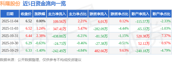 11月4日的资金流向数据方面,主力资金净流入109.56万元,占总成交额2.21%,游资资金净流入6.01万元,占总成交额0.12%,散户资金净流出115.57万元,占总成交额2.33%。