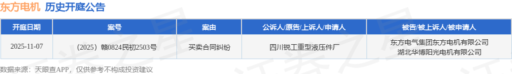 根据统计,近一年内以东方电气集团东方电机有限公司为当事人的历史开庭公告有1则,其中案由为“买卖合同纠纷”的公告以1则居首。历史开庭公告如下: