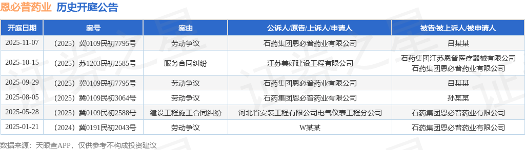 案号:(2025)冀0109民初7795号根据统计,近一年内以石药集团恩必普药业有限公司为当事人的历史开庭公告有6则,其中案由为“劳动争议”的公告以4则居首,其次为“建设工程施工合同纠纷”有1则,“服务合同纠纷”有1则。历史开庭公告如下: