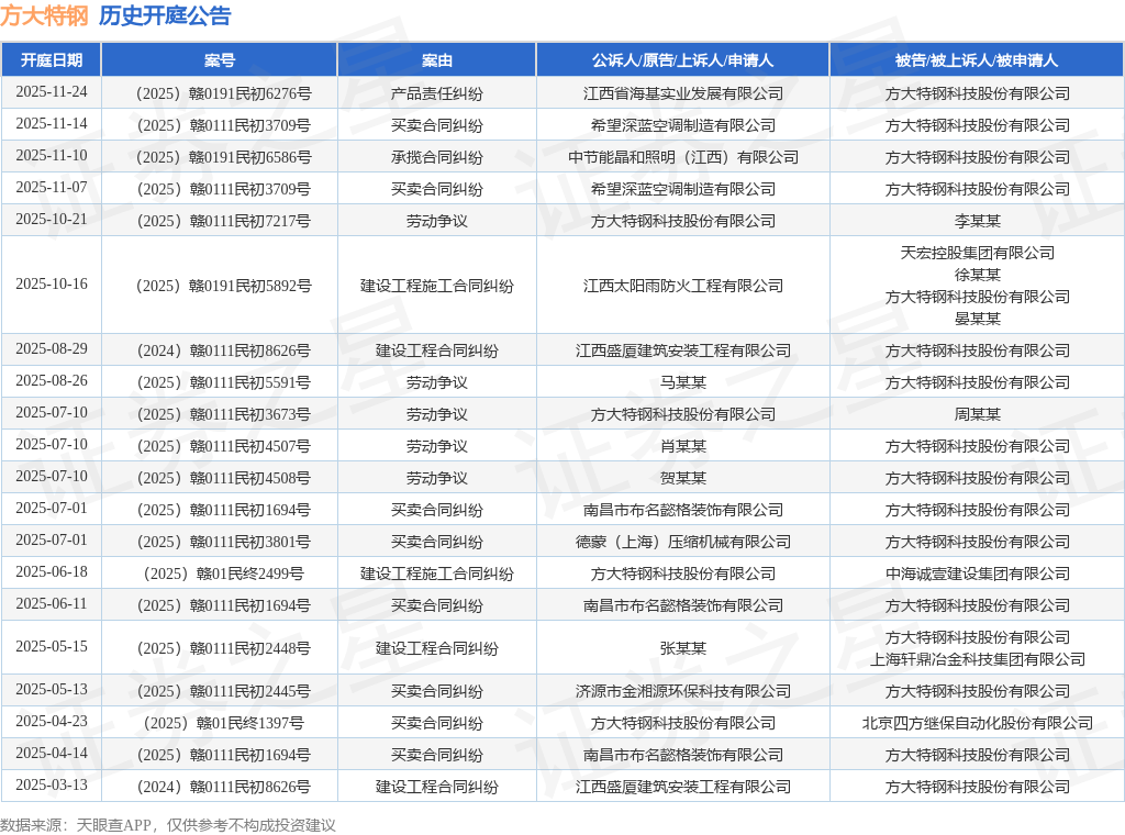 案号:(2025)赣0111民初3709号根据统计,近一年内以方大特钢科技股份有限公司为当事人的历史开庭公告有28则,其中案由为“买卖合同纠纷”的公告以11则居首,其次为“劳动争议”有5则,“建设工程合同纠纷”有3则。历史开庭公告(前20条)如下:
