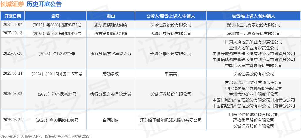 案号:(2025)粤0303民初20475号根据统计,近一年内以长城证券股份有限公司为当事人的历史开庭公告有6则,其中案由为“执行分配方案异议之诉”的公告以2则居首,其次为“股东资格确认纠纷”有2则,“劳动争议”有1则。历史开庭公告如下: