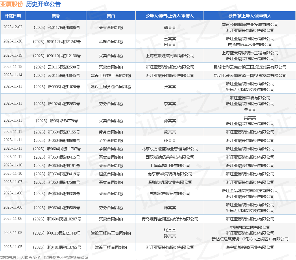 案号:(2025)浙0604民初7588号根据统计,近一年内以浙江亚厦装饰股份有限公司为当事人的历史开庭公告有580则,其中案由为“买卖合同纠纷”的公告以197则居首,其次为“劳务合同纠纷”有106则,“建设工程施工合同纠纷”有65则。历史开庭公告(前20条)如下: