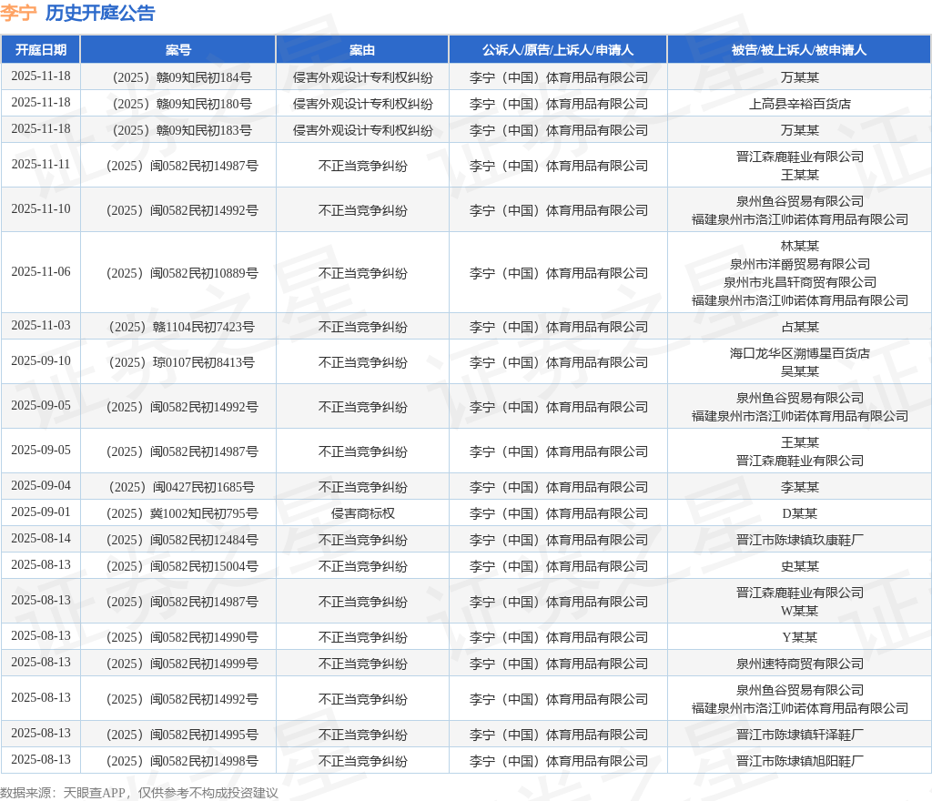 案号:(2025)闽0582民初10889号根据统计,近一年内以李宁(中国)体育用品有限公司为当事人的历史开庭公告有53则,其中案由为“不正当竞争纠纷”的公告以39则居首,其次为“侵害商标权纠纷”有5则,“侵害外观设计专利权纠纷”有3则。历史开庭公告(前20条)如下: