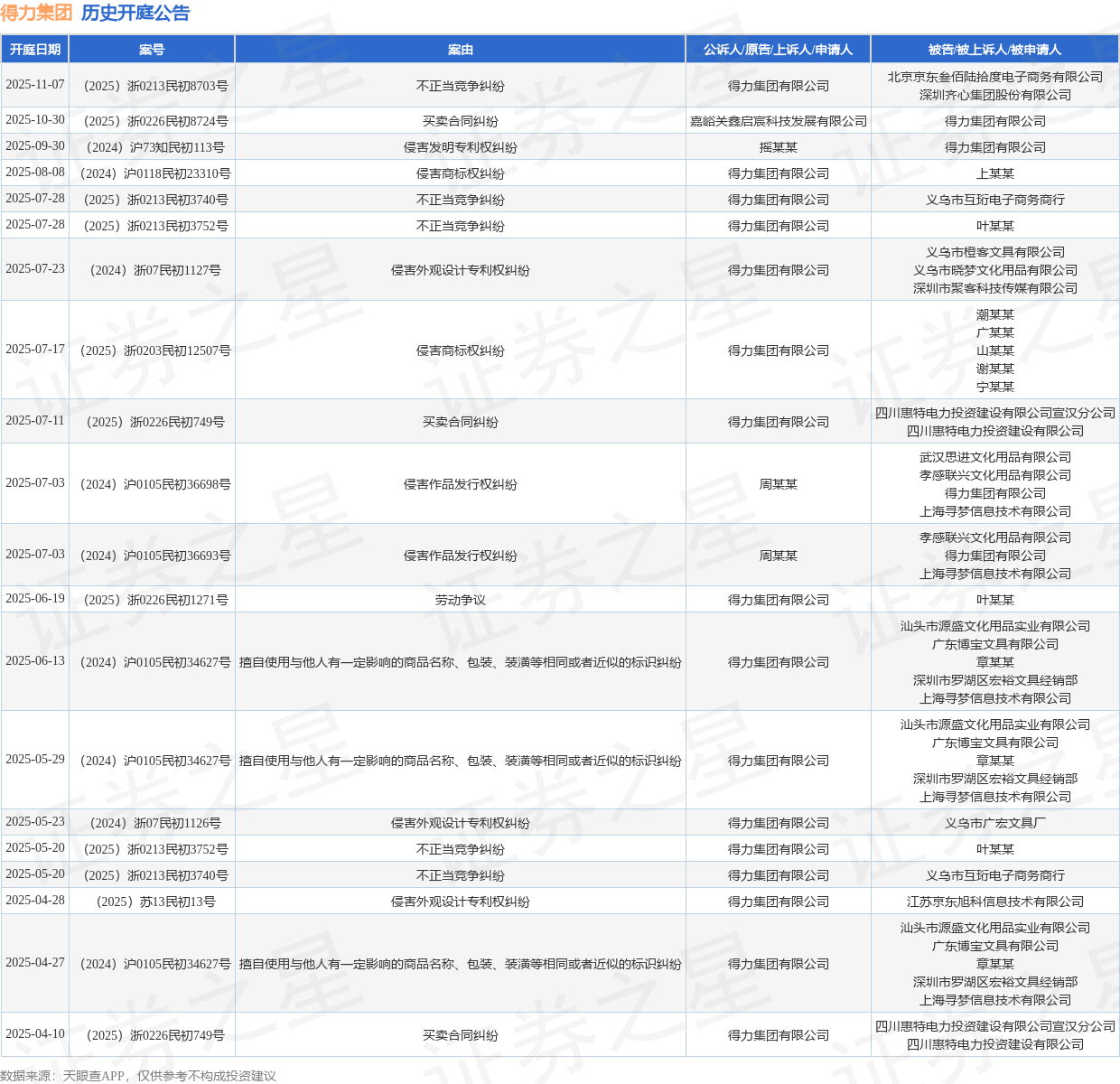 案号:(2025)浙0213民初8703号根据统计,近一年内以得力集团有限公司为当事人的历史开庭公告有30则,其中案由为“侵害商标权纠纷”的公告以7则居首,其次为“侵害外观设计专利权纠纷”有6则,“不正当竞争纠纷”有5则。历史开庭公告(前20条)如下: