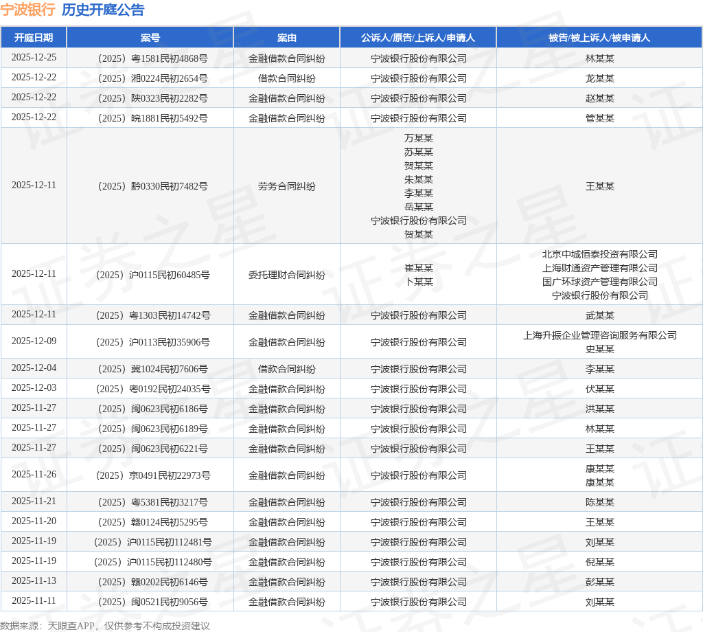 案号:(2025)浙0281民初14618号根据统计,近一年内以宁波银行股份有限公司为当事人的历史开庭公告有1830则,其中案由为“金融借款合同纠纷”的公告以1621则居首,其次为“借款”有119则,“借款合同纠纷”有52则。历史开庭公告(前20条)如下: