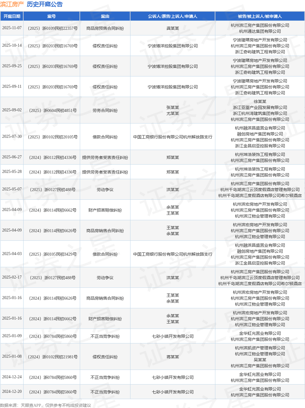 案号:(2025)浙0109民初22357号根据统计,近一年内以杭州滨江房产集团股份有限公司为当事人的历史开庭公告有19则,其中案由为“侵权责任纠纷”的公告以4则居首,其次为“不正当竞争纠纷”有3则,“借款合同纠纷”有2则。历史开庭公告如下: