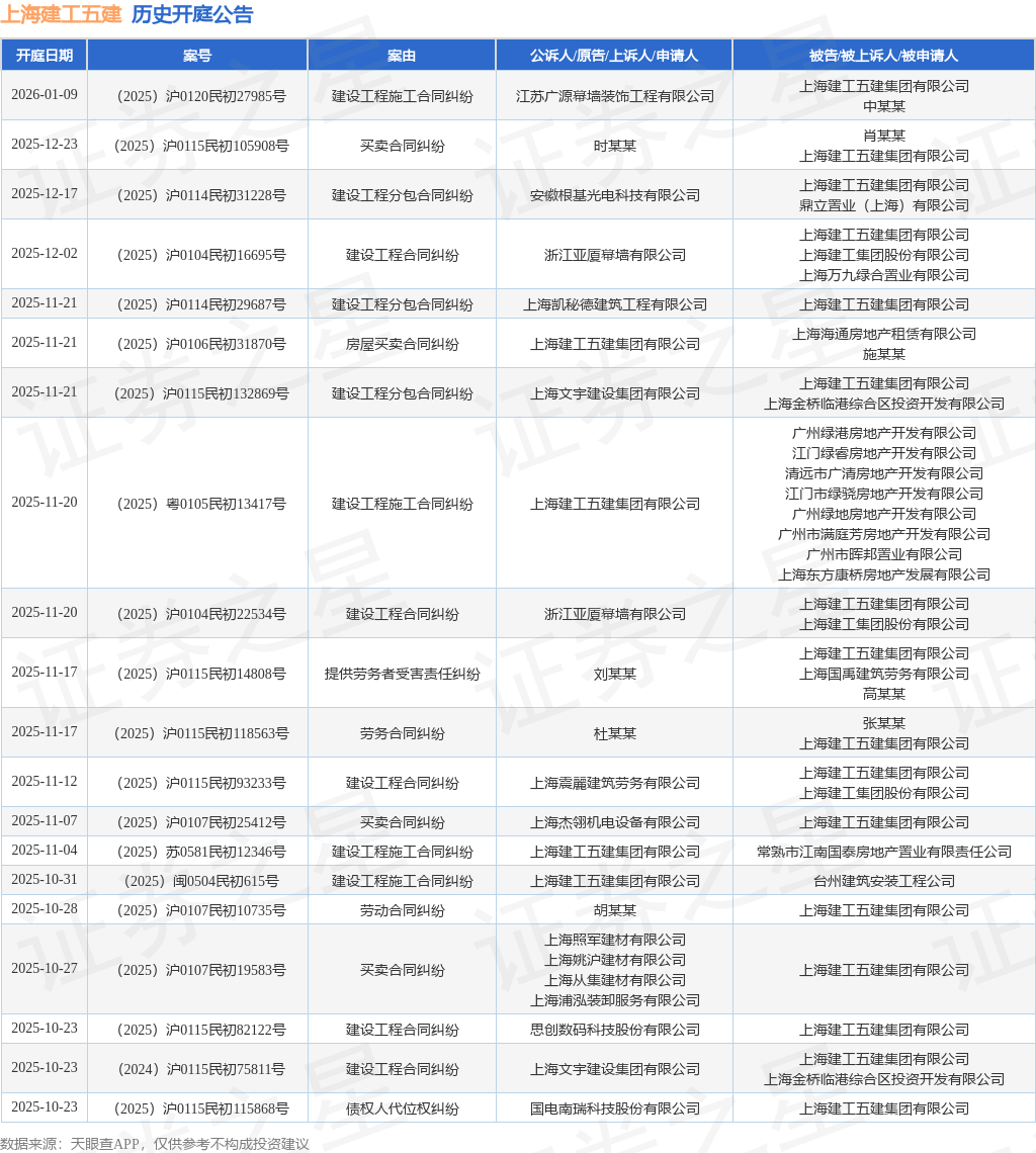 案号:(2025)沪0107民初25412号根据统计,近一年内以上海建工五建集团有限公司为当事人的历史开庭公告有302则,其中案由为“建设工程施工合同纠纷”的公告以61则居首,其次为“建设工程分包合同纠纷”有59则,“劳务合同纠纷”有35则。历史开庭公告(前20条)如下: