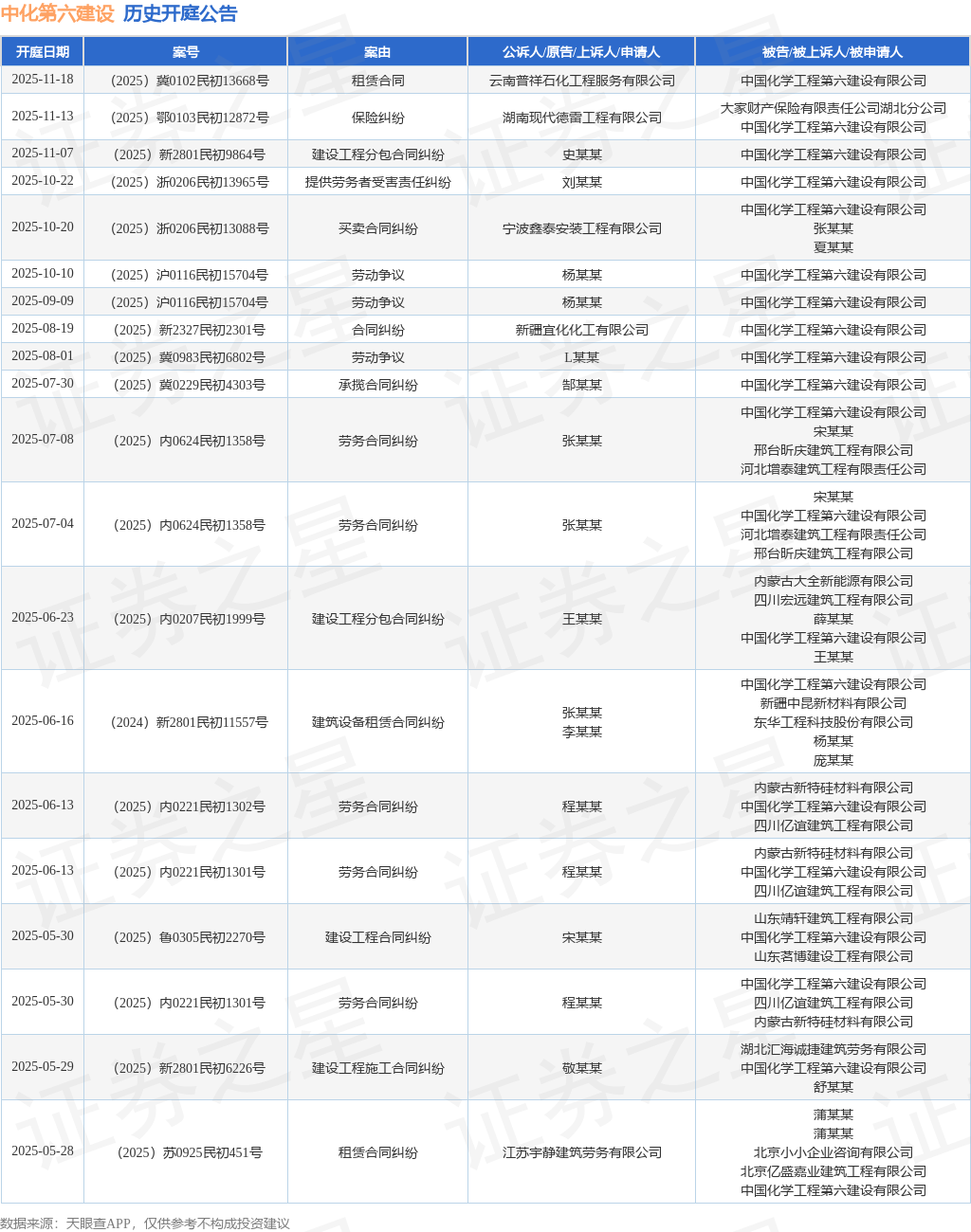 案号:(2025)新2801民初9864号根据统计,近一年内以中国化学工程第六建设有限公司为当事人的历史开庭公告有82则,其中案由为“劳务合同纠纷”的公告以27则居首,其次为“建设工程施工合同纠纷”有13则,“劳动争议”有8则。历史开庭公告(前20条)如下: