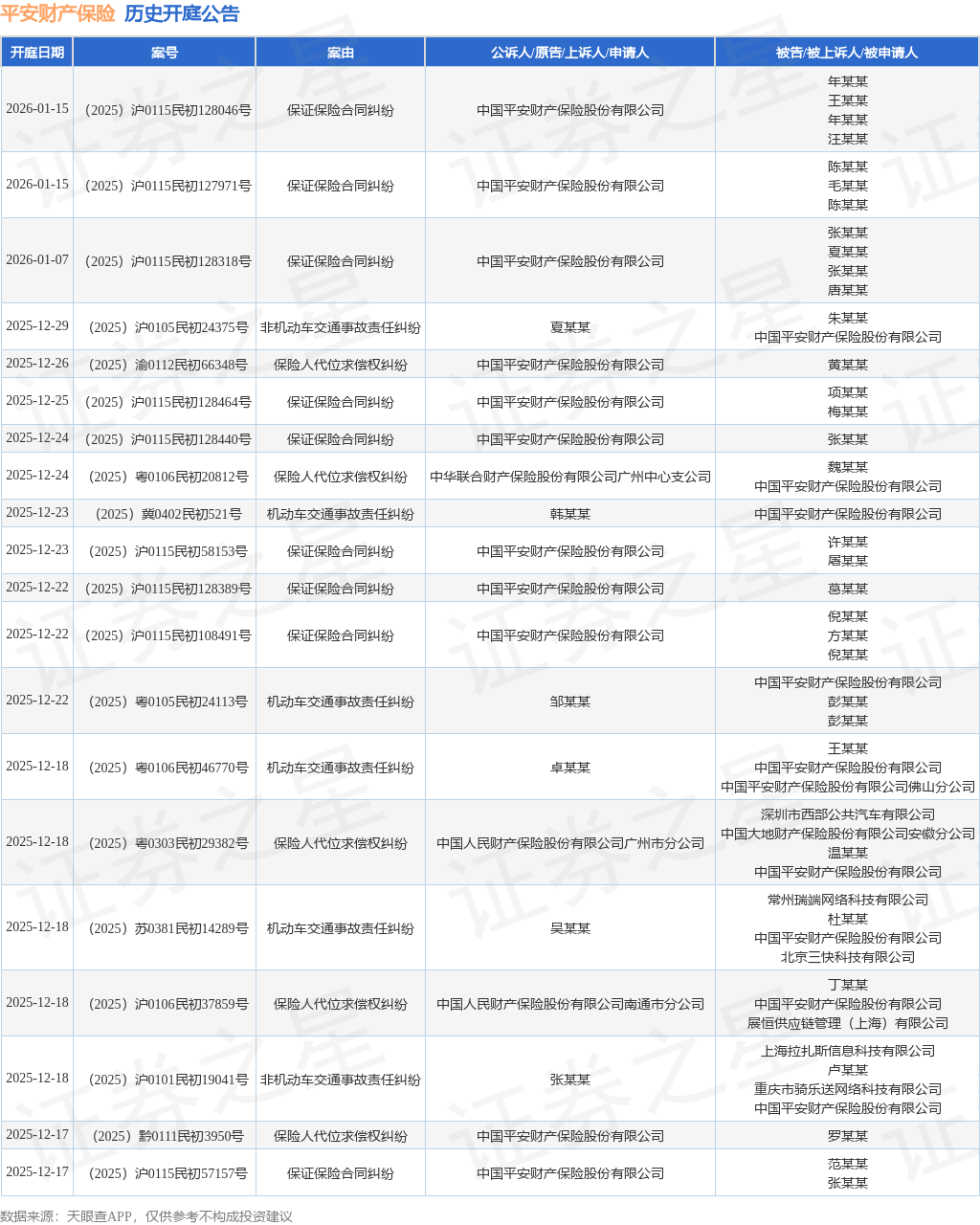 案号:(2025)沪0115民初70120号根据统计,近一年内以中国平安财产保险股份有限公司为当事人的历史开庭公告有2360则,其中案由为“机动车交通事故责任纠纷”的公告以1128则居首,其次为“保证保险合同纠纷”有295则,“保险人代位求偿权纠纷”有183则。历史开庭公告(前20条)如下: