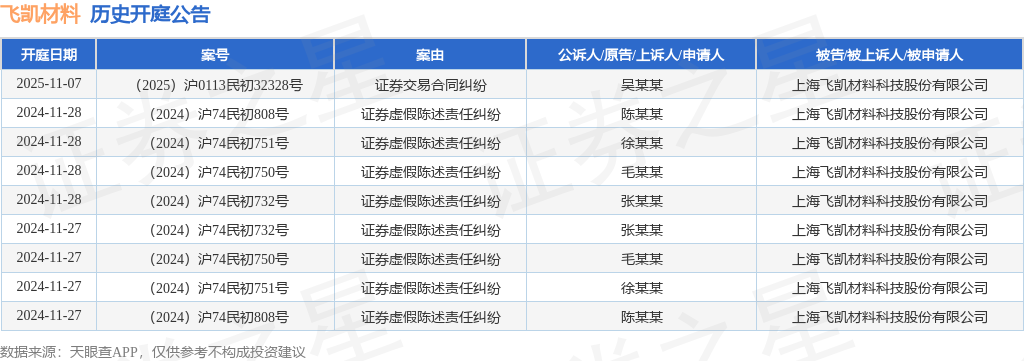 案号:(2025)沪0113民初32328号根据统计,近一年内以上海飞凯材料科技股份有限公司为当事人的历史开庭公告有9则,其中案由为“证券虚假陈述责任纠纷”的公告以8则居首,其次为“证券交易合同纠纷”有1则。历史开庭公告如下: