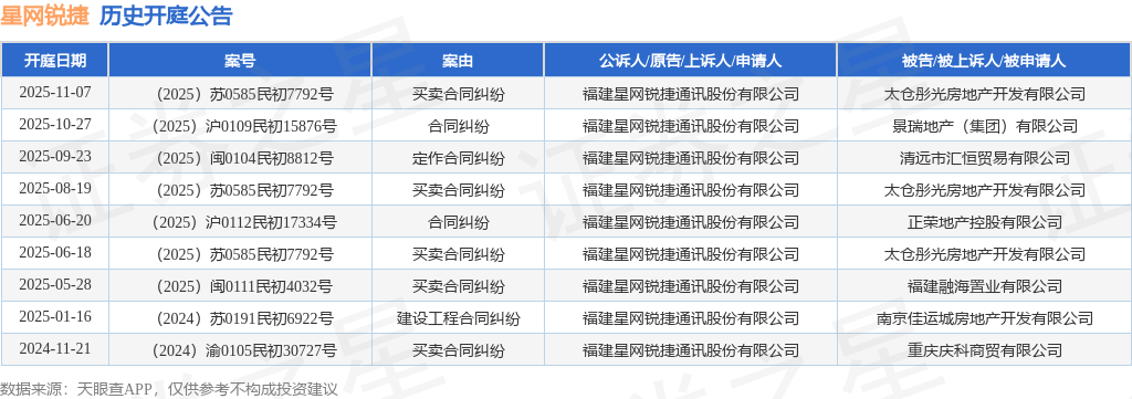 案号:(2025)苏0585民初7792号根据统计,近一年内以福建星网锐捷通讯股份有限公司为当事人的历史开庭公告有9则,其中案由为“买卖合同纠纷”的公告以5则居首,其次为“合同纠纷”有2则,“定作合同纠纷”有1则。历史开庭公告如下: