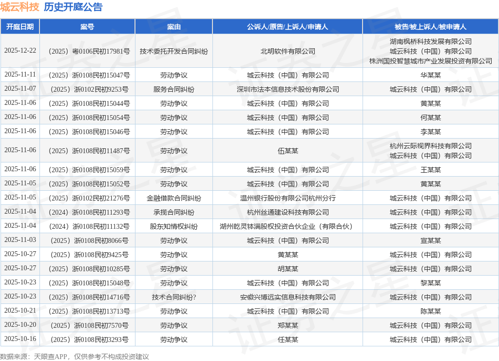 案号:(2025)浙0102民初9253号根据统计,近一年内以城云科技(中国)有限公司为当事人的历史开庭公告有160则,其中案由为“劳动争议”的公告以88则居首,其次为“合同纠纷”有23则,“服务合同纠纷”有11则。历史开庭公告(前20条)如下: