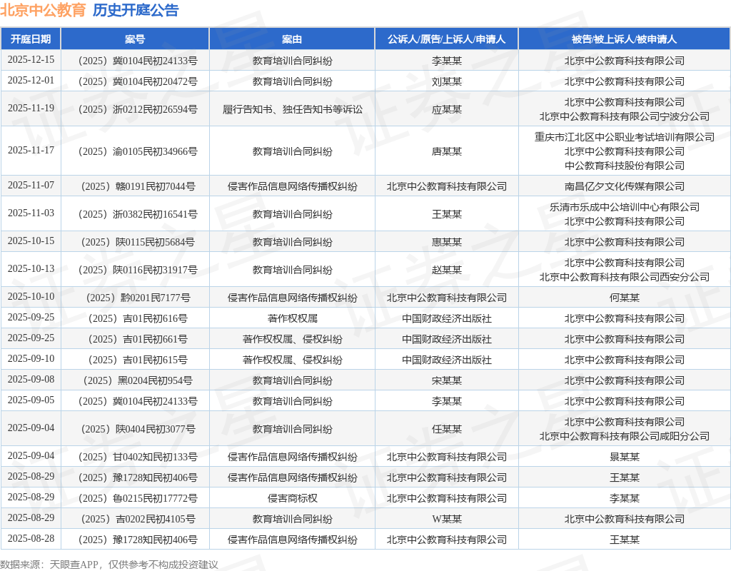 案号:(2025)赣0191民初7044号根据统计,近一年内以北京中公教育科技有限公司为当事人的历史开庭公告有347则,其中案由为“教育培训合同纠纷”的公告以250则居首,其次为“服务合同纠纷”有23则,“合同纠纷”有22则。历史开庭公告(前20条)如下: