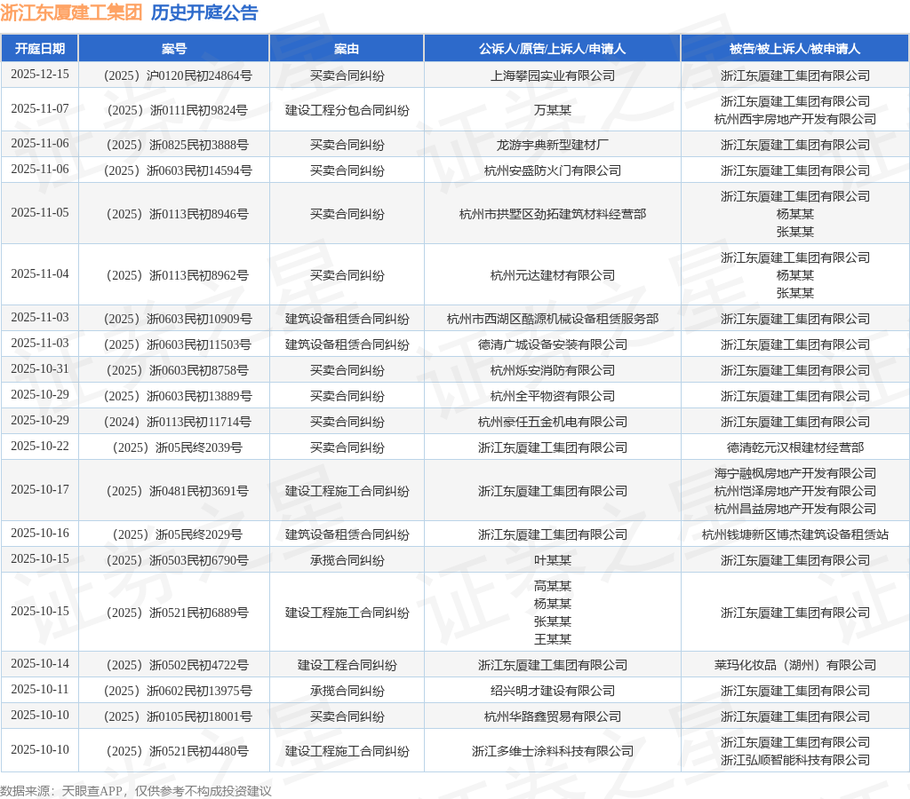 案号:(2025)浙0111民初9824号根据统计,近一年内以浙江东厦建工集团有限公司为当事人的历史开庭公告有132则,其中案由为“买卖合同纠纷”的公告以34则居首,其次为“建设工程施工合同纠纷”有22则,“合同纠纷”有14则。历史开庭公告(前20条)如下:
